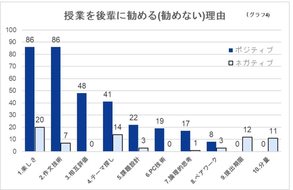授業を後輩に勧める・勧めない理由を、自由記述式で問うた。先に②で示した「ポジティブ/ネガティブ」の観点で回答を2分し、さらにそれぞれの記述内容を10項目に類型化して回答を分析した(グラフ4)。ポジティブな回答として最も多かったのは「楽しさ」「作文技術」である。「楽しさ」に言及した記述は86件あり、苦手意識の強い作文課題に対し、6割近い生徒から全体的な肯定感が得られた。「作文技術」に言及したコメントも同様に86件。カキナーレ実施により、少なくとも生徒の自己評価としては、作文技術向上の実感が得られていたことがわかる。