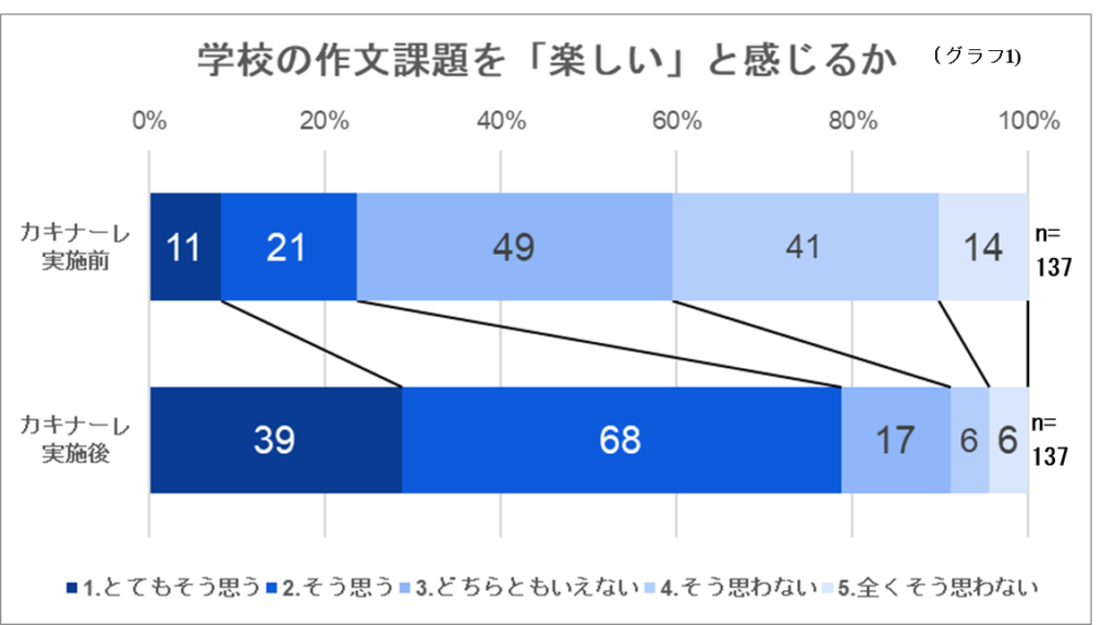 学校の作文課題を「楽しい」と感じるか、5件法選択式で問うた。カキナーレ実施の前後で同じ質問を問い、それぞれの結果を比較した(グラフ1)。ネガティブな回答「どちらともいえない/そう思わない/全くそう思わない」を選択した生徒は、授業実施前では学年全体の78%に上る。これが、授業実施後の同じ設問では22%へと減少した。また、生徒の回答を個別に概観しても、授業実施後の回答は概ね1段階、ポジティブ寄りの回答に移行した。このグラフからだけでも、授業は作文課題の苦手意識払拭に対して、ある程度の効果があったことが伺える。
