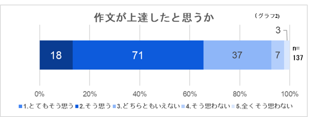 さらに(グラフ2)が示すように、「カキナーレを通じて作文が上達したと思うか」を問う設問でも、自己評価とはいえ65%の生徒が、授業によって作文が上達したと回答している。授業者からの細かな指示や添削指導をほとんど行っていないにもかかわらず、生徒同士の相互評価のみによって高い自己評価を得られたこともまた、彼らの「書き慣れ」を示すデータといえる。