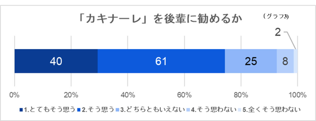 学習経験を客観的に評価する設問として、「カキナーレのような授業を後輩に勧めるか」を設けた(グラフ3)。先に示した授業の「楽しさ」への回答は、作文が好き・嫌い・得意・苦手など、生徒自身の状況によって変化する。一方で、第三者である後輩に推奨するかを考える場合、授業に対する評価はある程度の客観性を持つ。74%の生徒が「とてもそう思う/そう思う」とポジティブな回答を示し、次項で示す自由記述回答からは、ペンネームでの作品公開と相互評価の楽しさが、結果として「書き慣れ」に繋がったという実感を、生徒自身も持っていたことがわかった。一方で「どちらともいえない」には、「自身は楽しく書いたが、作文が苦手な人が多いので勧められない」などが回答理由として挙がった。やはりこのデータにも「作文課題は(一般的に)面白くない」という認識が、他者に勧めるか否かに影響していることがわかった。
