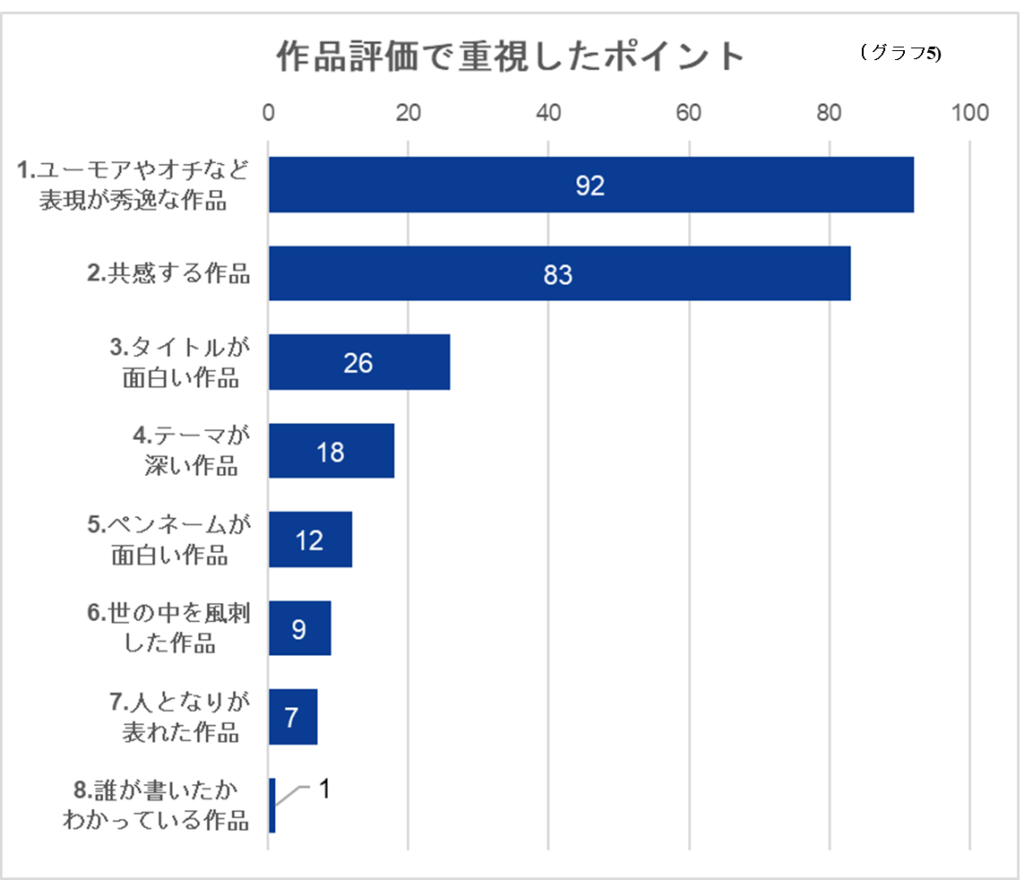 生徒がどのような観点で、他の生徒作品を評価していたのかも調査した(グラフ5)。「文章表現の秀逸さ」「共感」といった選択肢に回答が集中し、「カキナーレの基本原則」とも対応する。授業で生徒に示した基本原則は、「自由に書いてよい」という制約のなさを与える一方、生徒作品が面白くなるための仕掛けも盛り込まれている。何気ない日常を「テーマ」で切り取り、多少のフィクションも織り交ぜながら面白い作品に仕上げる手法は、生徒にも受け入れられた。その様な手法で書かれた作品が、生徒自身の思う「よさ」とも合致し、相互評価に影響を与えたようである。