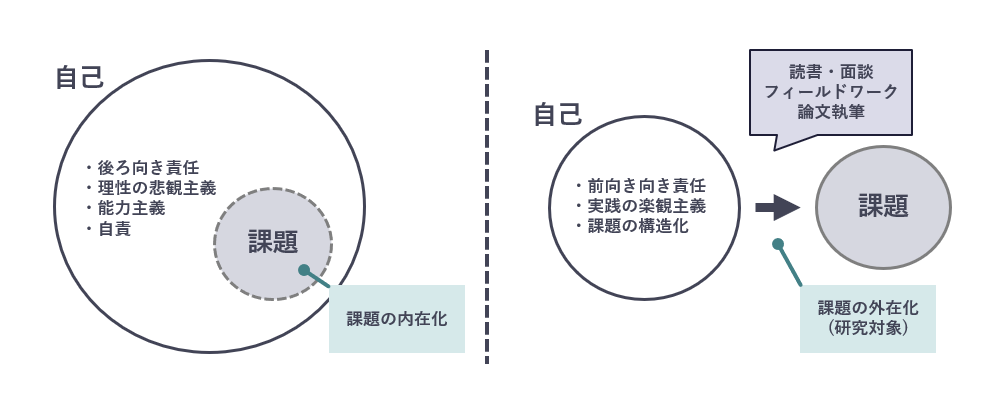 生徒は自分の悩みやしんどさの問題を内面化し、しばしば自分自身に「後ろ向き責任」を問う。そうした状況は、研究のはじめに書く「動機レポート」によく現れる。「自分がコンプレックスを抱えているのは○○ができないからだ」「もっと努力して○○のような能力を身につけなければ」「人と話せないのはコミュ力が低いからだ」といった、ある種の能力主義的な価値観(=後ろ向き責任)が、彼ら自身の内に責任追及的な自己を作り出す。研究の開始直後は、そんな自分をどうにかするためのHow-Toとして、読書や研究活動を行いはじめる。